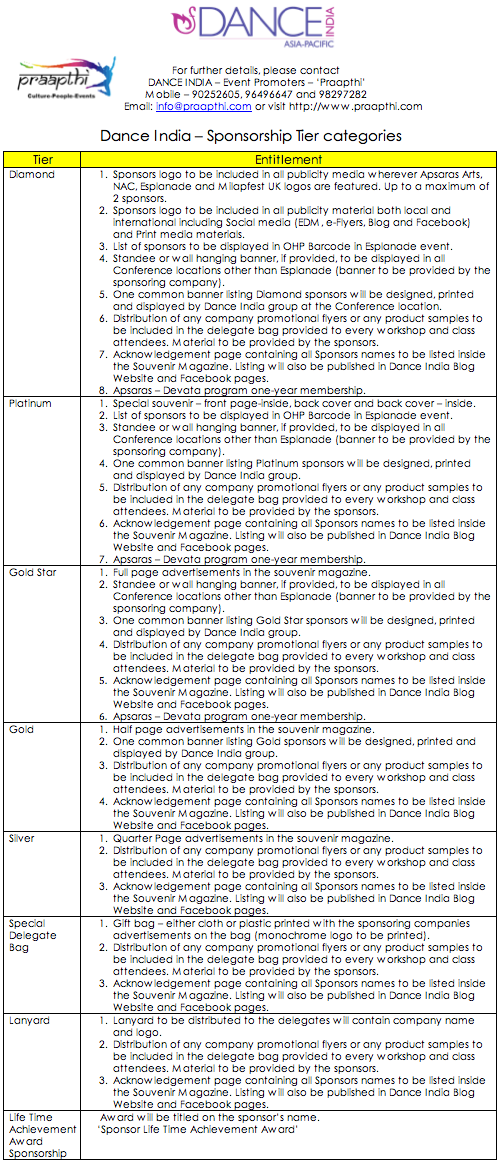 Event Promoter for Dance India 2016. Listed below are the sponsorship opportunities. Please contact 90252605 or info@praapthi.com for more details